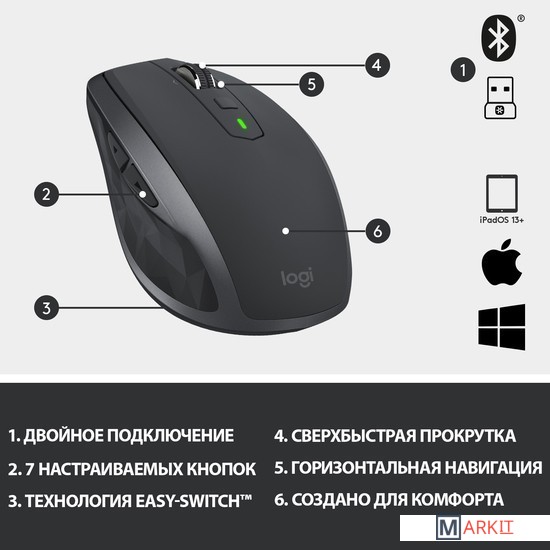 Главной особенностью данной мыши является поддержка технологии Logitech Flow, с помощью которой можно одновременно использовать мышь на трех устройствах. Кроме того, благодаря лазерного датчику Logitech Darkfield данную мышь можно использовать даже на стеклянных поверхностях.